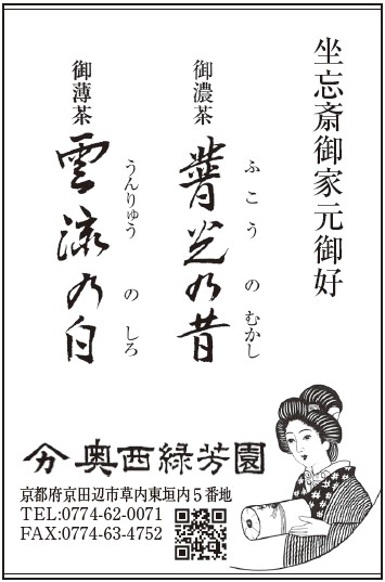 慶応元年(1865年)より、お茶の栽培、製造、販売業を始め、現在は五代目園主、奥西和男。皇室御用達、大徳寺の立花大亀和尚のお好みのお茶として吉兆嵐山、鎌倉円覚寺などにお茶を卸しております。