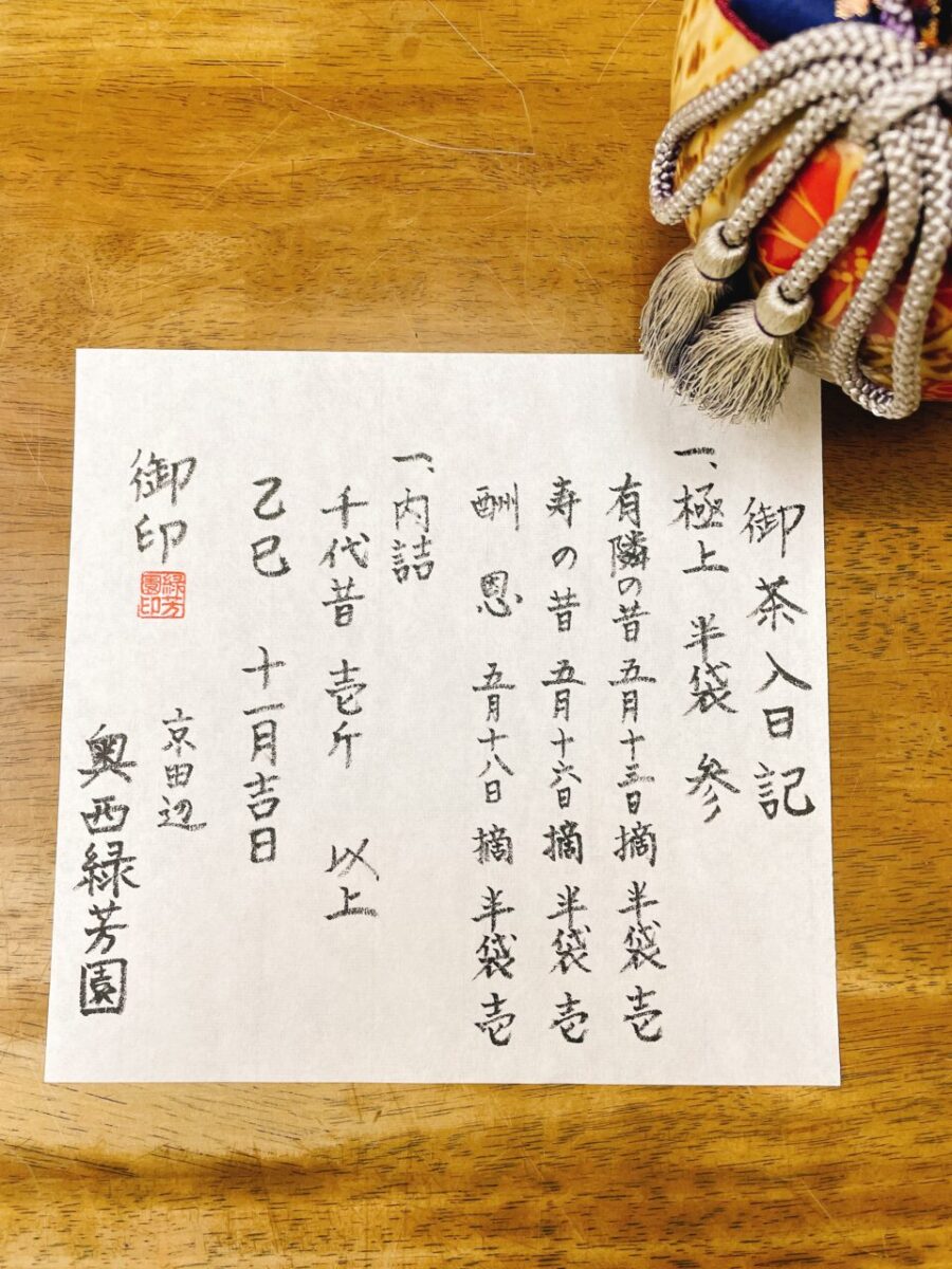 入日記は茶壷を納めた箱の蓋の裏に貼り付けます。